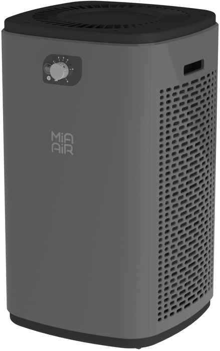 Очиститель воздуха Mia Air (Мия Эир) Lite антрацит (без сенсорного экрана), оснащенный HEPA-фильтром. Очистка воздуха достигается значительным уменьшением количества пыли в окружающем воздухе. Забор воздуха осуществляется через предварительный фильтр, а очищенный проходит через УФ-лампу и выпускается через диффузор.